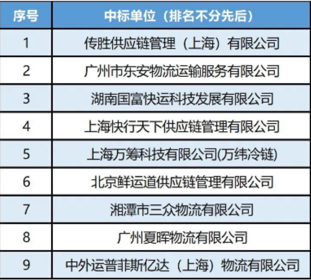 據(jù)介紹,本次招標(biāo)吸引來自全國各地包括順豐、中外運、新夏暉、萬緯物流、傳勝供應(yīng)鏈、快行天下等知名企業(yè)在內(nèi)的共57家企業(yè)報名,通過資格審查24家,最終到場參與開標(biāo)的24家(23家現(xiàn)場、1家線上),經(jīng)過評審小組的多輪評審及議價,結(jié)合投標(biāo)單位服務(wù)調(diào)配能力、線路覆蓋網(wǎng)絡(luò)、服務(wù)價格等三方面進(jìn)行綜合考量并最終確定以下9家單位中標(biāo),分別如下: