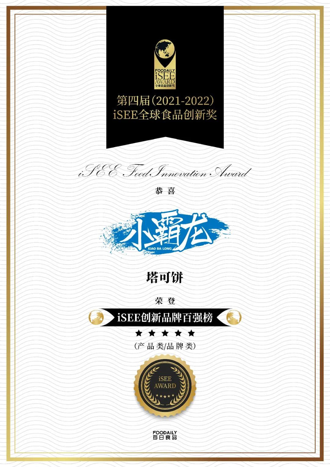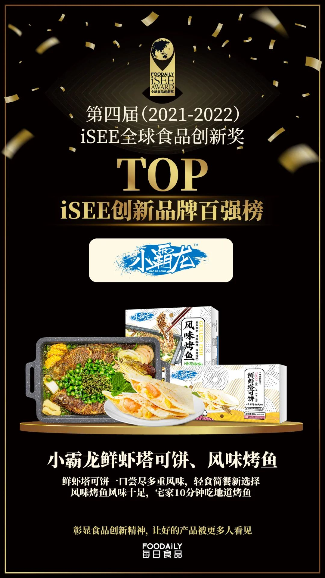 2022年3月24日,由“Foodaily每日食品”發起的第四屆(2021-2022)iSEE全球食品創新獎(以下簡稱iSEE創新獎),隆重公布產品類&品牌類【iSEE創新品牌百強榜】。國聯水產集團旗下預制菜品牌“小霸龍”,憑借風味烤魚、鮮蝦塔可餅殺出重圍,光榮上榜。