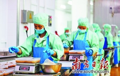 3月15日,在廣東國美水產食品有限公司的加工生產車間內,工人們在流水線崗位上切魚、清洗、分揀,操作嫻熟,秩序井然。“我們公司擁有多條先進加工生產線,年加工羅非魚片能力達2萬噸。在烤魚制作過程中,公司運用先進技術保證產品口感鮮嫩。”廣東國美水產食品有限公司副總經理唐岸蓮說。